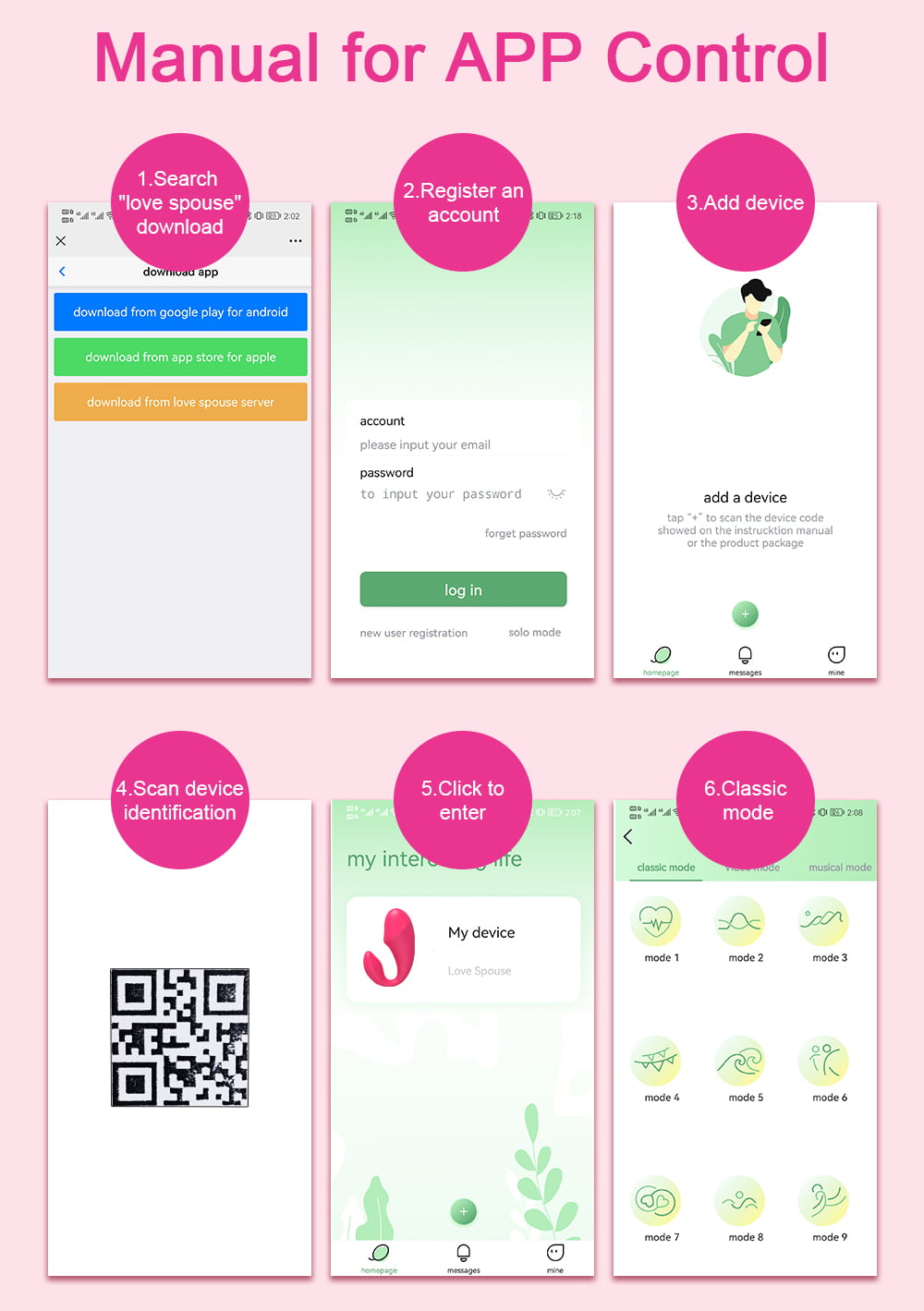 Zeskanuj kod QR, zainstaluj aplikacje i użyj telefonu do sterowania wibratorem.